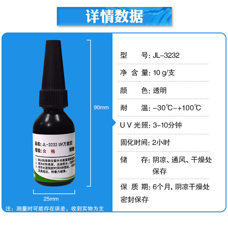 JL-3232 UV invisible glue, which can bond glass, tea tables and metals. It is a strong UV adhesive, a transparent UV adhesive for acrylic that cures under ultraviolet light.