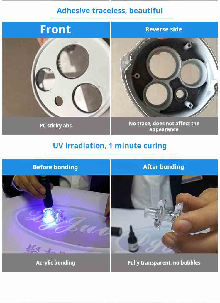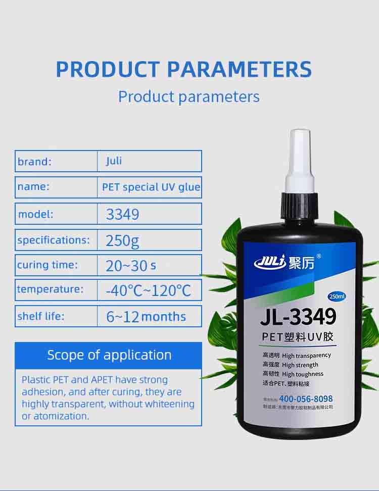 JL-3349 Transparent PET UV Curing Adhesive. UV Curing Adhesive for Bonding PET Plastic Folding Boxes and Glass Lighting Fixtures