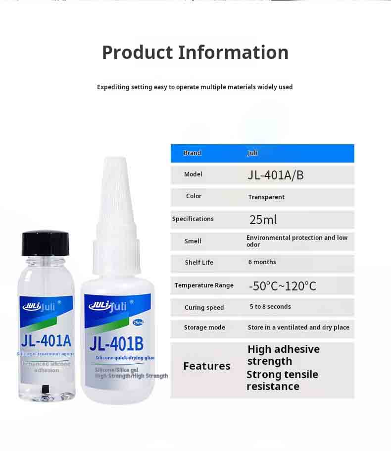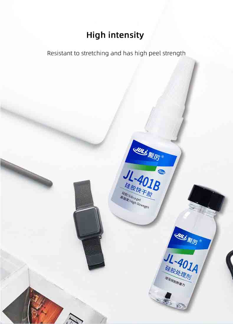 JL-401ABInstant adhesive for bonding silicone rubber with plastic and metal. Flexible quick-drying silicone rubber adhesive.