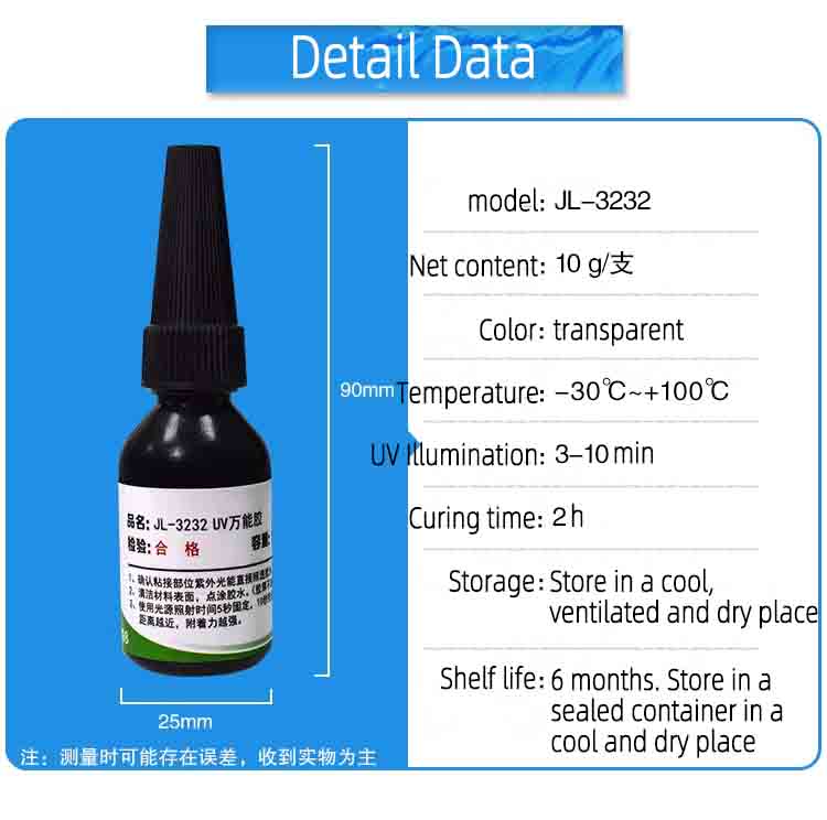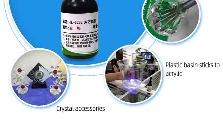 UV invisible glue, which can bond glass, tea tables, metals and crystals. It is transparent and leaves no marks. It is an all-purpose UV glue for curing under ultraviolet light, suitable for PC, acrylic and PET.